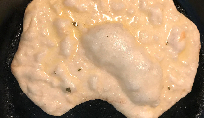 Put naan in the middle of the cast-iron skillet for a minute or so, and then flip. Naan bread should start to puff up and irregular dark circles form. Serve hot.